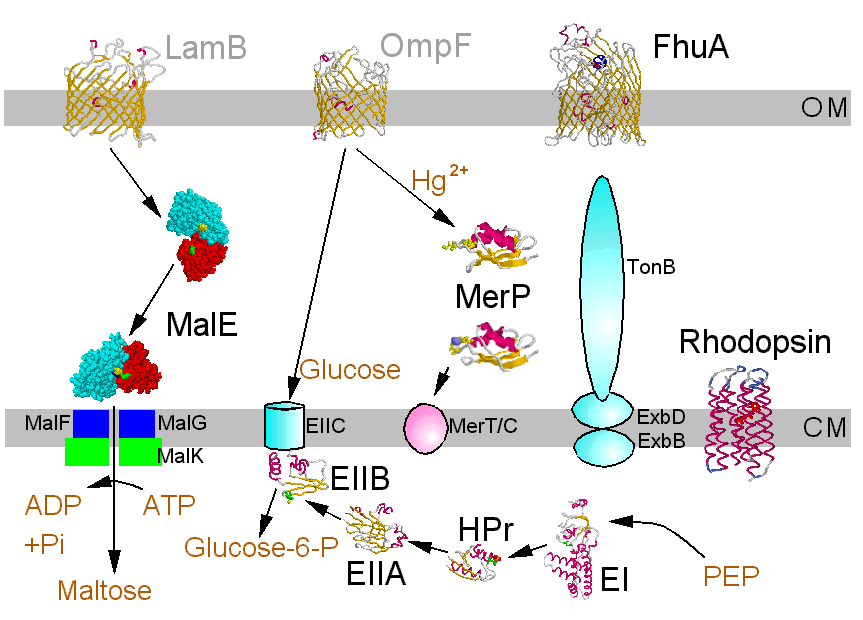 Als Beispiele werden hier die Bindeproteine für den Transport von Maltodextrinen und Quecksilber gezeigt, für Protonentransport ein Bakteriorhodopsin, Komponenten des Glucose-PTS aus E. coli und FhuA, das als Ausnahme in der äußeren Membran von E. coli als energieabhängiges Transportsystem für siderophorgebundenes Eisen, Antibiotica und Phagen-DNA sowie Colicine dient. Anklicken der Strukturbilder führt weiter.